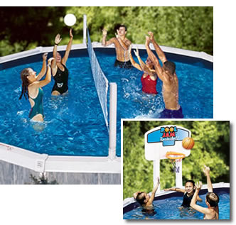 Now you can enjoy your two favorite pool games, volleyball and basketball. Both volleyball and basketball games feature rugged construction that will hold up to slam dunks and vicious spikes. Both games attach to your pool's top rail by our patent-pending breakaway bracket. Both games come complete with realistic game balls. Installation is quick and easy.