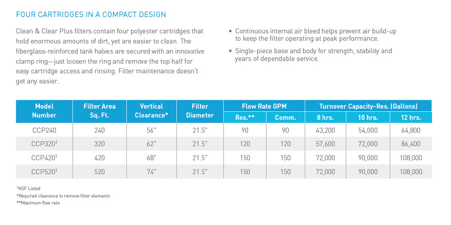 | Fiberglass Reinforced Polypropylene Tank Clean & Clear® Plus Cartridge Filters have a corrosion resistant injection molded filter tank featuring superior strength and reliability. The cartridge assembly uses four easy to clean, non-woven, polyester cartridges. Each filter is supplied with a bulkhead union set for easy installation. Features •NSF listed •Superior strength •Large filter area for increased dirt capacity •1-1/2 in., 100% drain clean-out port •Continuous High Flow™ internal air relief* •Base and plumbing kits now available •Injection molded tank •Balanced hydraulic flow •Tension Control™ clamp •100% factory tested •Black bulkhead unions •High Flow manual air relief valve Note: Actual system flow will depend on plumbing size and other system components. Note: Pentair Pool Products does not recommend flow rates above 150 GPM. *Integrated Continuous High Flow internal air relief is operational only when there is unobstructed flow in the circulating system. Operating Limits - maximum continual operating pressure of 50 PSI. Pool.spa (bather) applications, maximum operating water temperature (internal filter) 104 degrees F (40 degrees C) |