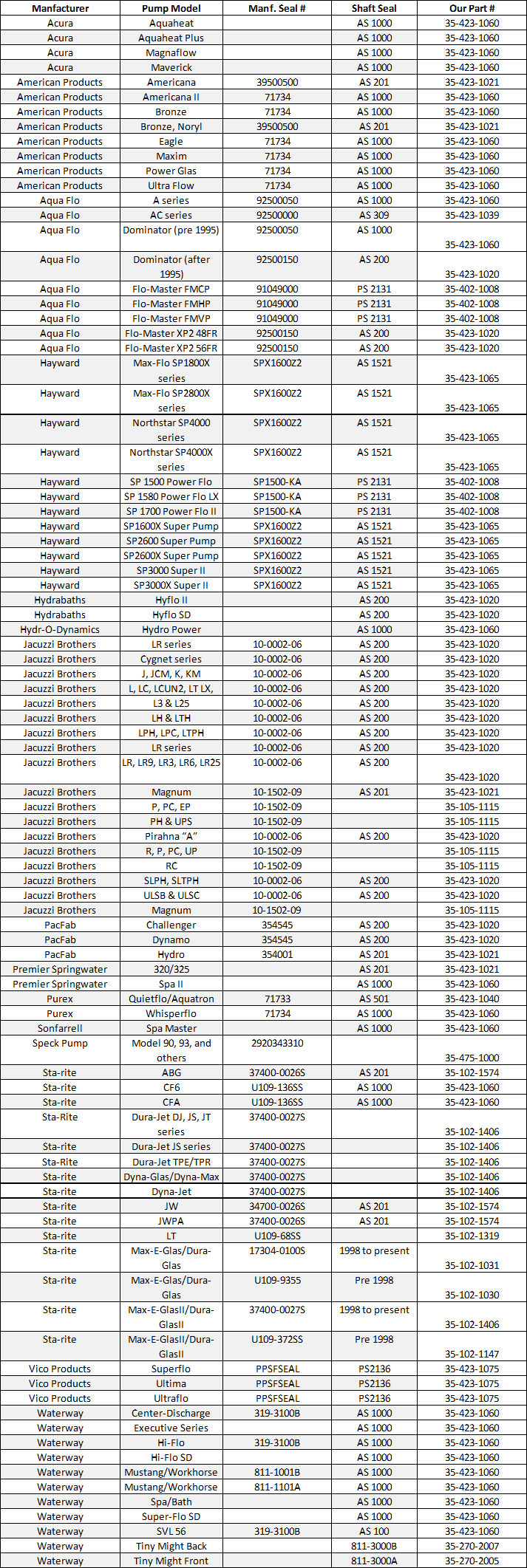 Use the chart below to help find the correct Pump Seal for your pump. Once you find the correct part, use "Our Part #" in the search to locate it in our store.